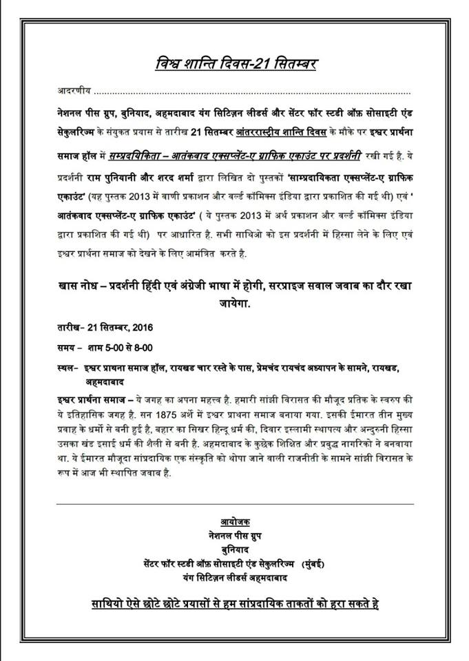 नेशनल पीस ग्रुप, बुनियाद, अहमदाबाद यंग सिटिज़न लीडर्स और सेंटर फॉर स्टडी ऑफ़ सोसाइटी एंड सेकुलरिज्म के संयुकत प्रयास से तारीख 21 सितम्बर आंतररास्ट्रीय शान्ति दिवस के मौके पर इश्वर प्राथना समाज हॉल में एक प्रदर्शनी रखी गई है. ये प्रदर्शनी राम पुनियानी और शरद शर्मा द्वारा लिखित दो पुस्तकों ‘साम्प्रदायिकता एक्सप्लेंट-ए ग्राफिक एकाउंट’ एवं ‘ आतंकवाद एक्सप्लेंट-ए ग्राफिक एकाउंट’ पर आधारित है. सभी साथिओ को इस प्रदर्शनी में हिस्सा लेने के लिए एवं इश्वर प्राथना समाज को देखने के लिए आमंत्रित करते है.