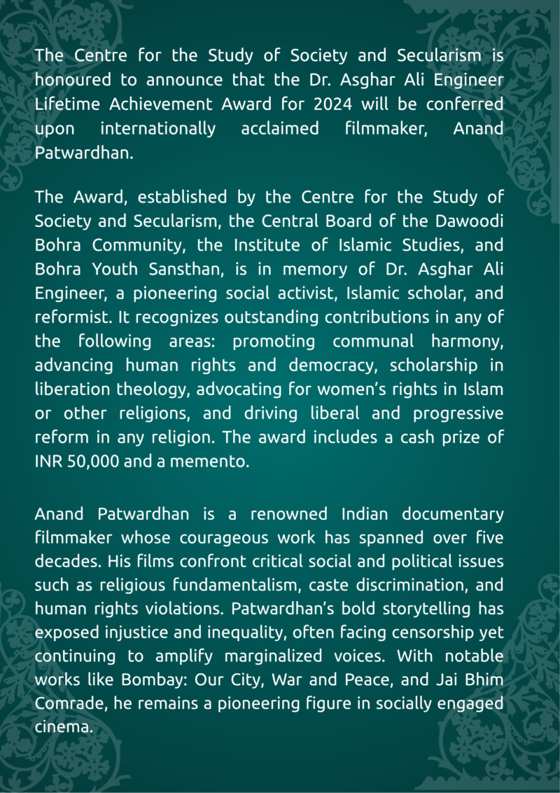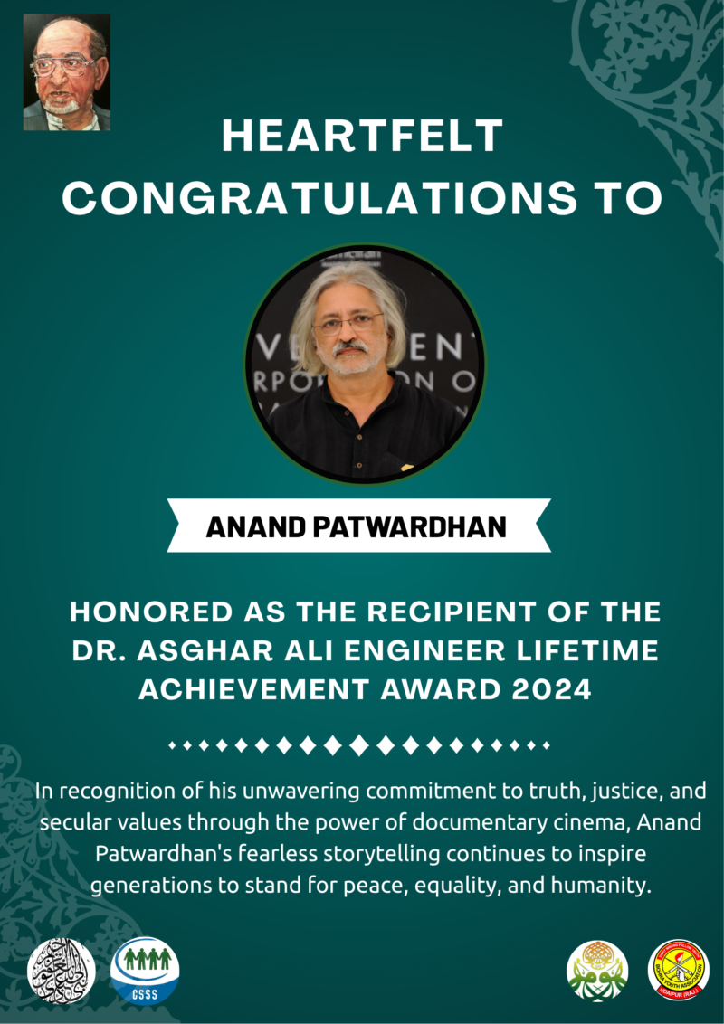 Announcement Memorial AwardsDr. Asghar Ali Engineer Lifetime Achievement Award, 2024 is conferred upon Anand PatwardhanPosted on November 3, 2025November 3, 2025byAdmin Make a donation to support us Donate Like Tweet Share Share Admin Previous Article Youth Engagements Peaceful Conflict Transformation in Manipur: A Report on Workshop on Freedom of Religion or Belief Posted on November 3, 2025November 3, 2025byAdmin View Post You May Also Like View Post Memorial Awards Dr. Asghar Ali Engineer Best Published Paper Award (2023-2024) is awarded to Dr. Qazi Sarah Rasheed Posted on August 25, 2025August 25, 2025byAdmin View Post Announcement Memorial Awards We Invite nominations for Dr.Asghar Ali Engineer Memorial Lifetime Achievement Award 2024 Posted on July 4, 2025July 4, 2025byAdmin View Post Announcement CSSS honoured at the “Samashti Art & Literature Festival 2025 Posted on April 16, 2025April 16, 2025byAdmin View Post Memorial Awards Dr. Asghar Ali Engineer Lifetime Achievement Award, 2023 is conferred upon Adv. Indira Jaising, and posthumously on Fr. Stan Swamy Posted on December 24, 2024December 24, 2024byAdmin View Post Memorial Awards Calling for Submission of published papers for the Dr. Asghar Ali Engineer Best Published Paper Award 2023 – 24 Posted on November 5, 2024November 5, 2024byAdmin View Post Announcement Weaponisation of Hindu Festivals – A New Book Written by Irfan Engineer and Neha Dabhade Posted on October 29, 2024October 29, 2024byAdmin View Post Memorial Awards Dr. Asghar Ali Engineer Best Published Paper Award (2022-2023) is awarded to Prof. Jharna Pathak. Posted on June 27, 2024June 27, 2024byAdmin View Post Memorial Awards We Invite nominations for Dr.Asghar Ali Engineer Memorial Lifetime Achievement Award 2023 Posted on May 16, 2024May 16, 2024byAdmin Leave a Reply Cancel reply Your email address will not be published. Required fields are marked * Your Comment * Name * Email * Website Save my name, email, and website in this browser for the next time I comment.
